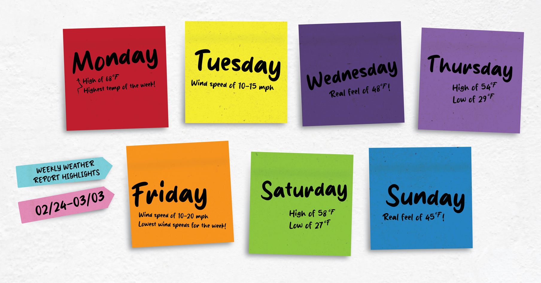- Monday: HI 68℉ / LO 32 ℉ with a real feel of 68 ℉