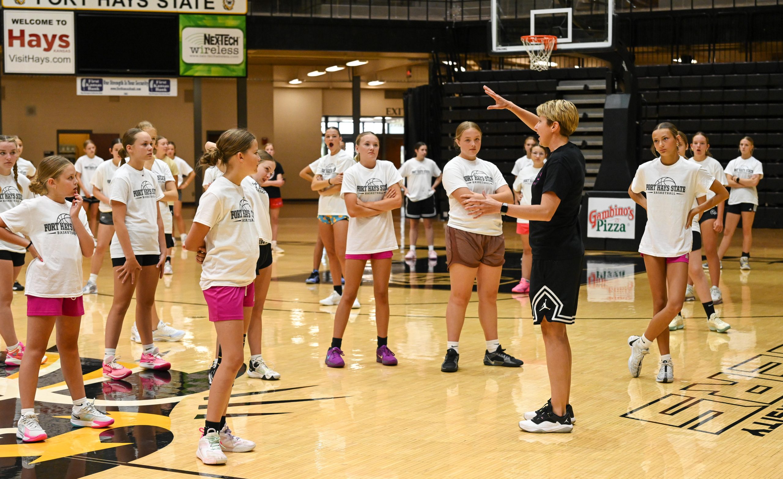 This week, members of the Fort Hays State University women’s basketball team were led by Head Coach Talia Kahrs to teach students in third through 12th grade about skills they use in the game. The camp was broken down into sessions where each grade learned breakdown drills, shooting tidbits and dribbling tricks inside Gross Memorial Coliseum.