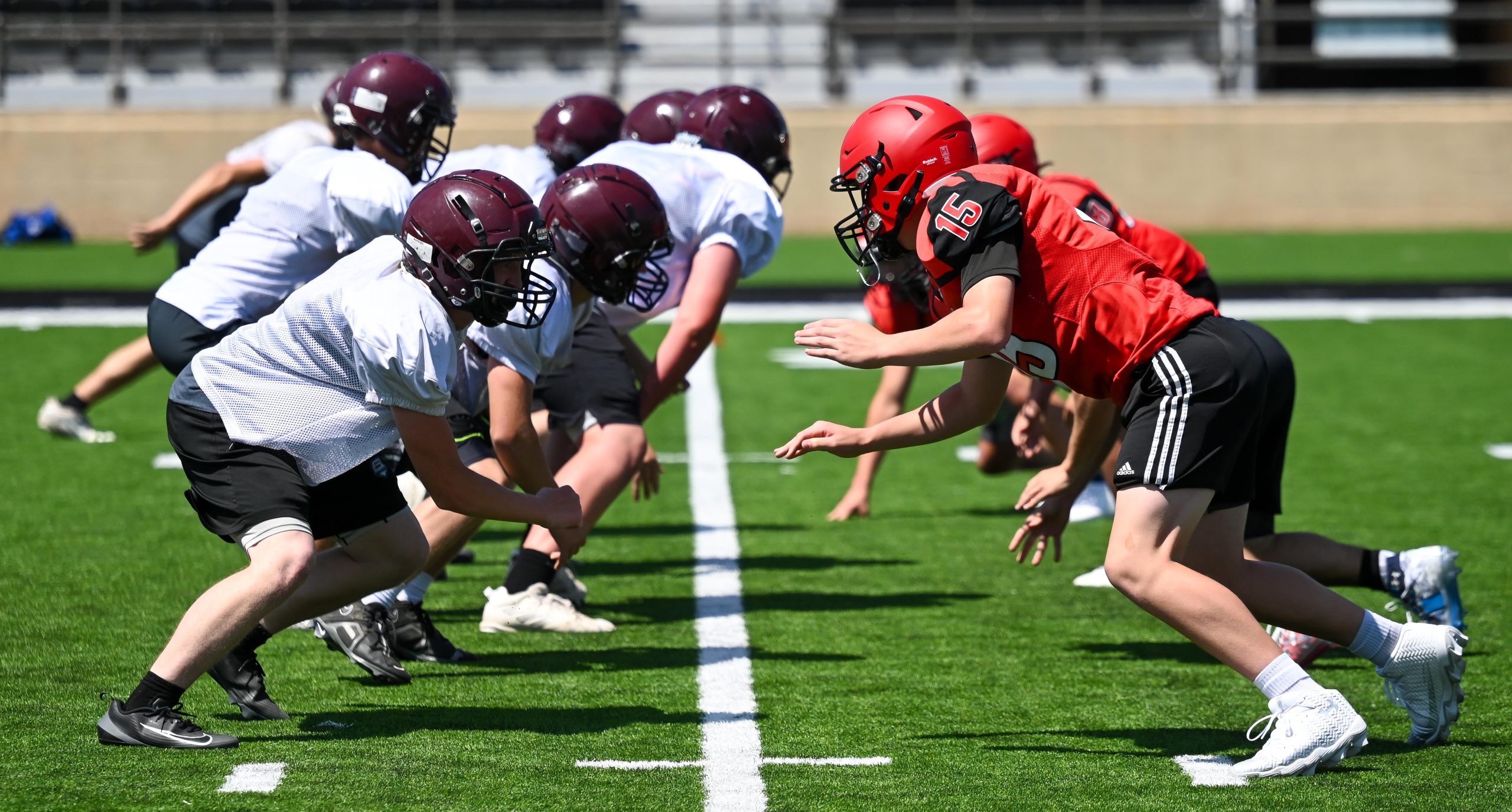 FHSU Football staff hosted an 8-Man Football team camp on Wednesday at Lewis Field for High School students from St. John, St. Francis, Victoria, Hoxie and Kenesaw to test their athletic skills and learn the fundamentals of Football. Each team was taught about playing technique by Tigers Head Coach Chris Brown while practicing in scrimmages, competing against each other, and gaining value in teamwork.