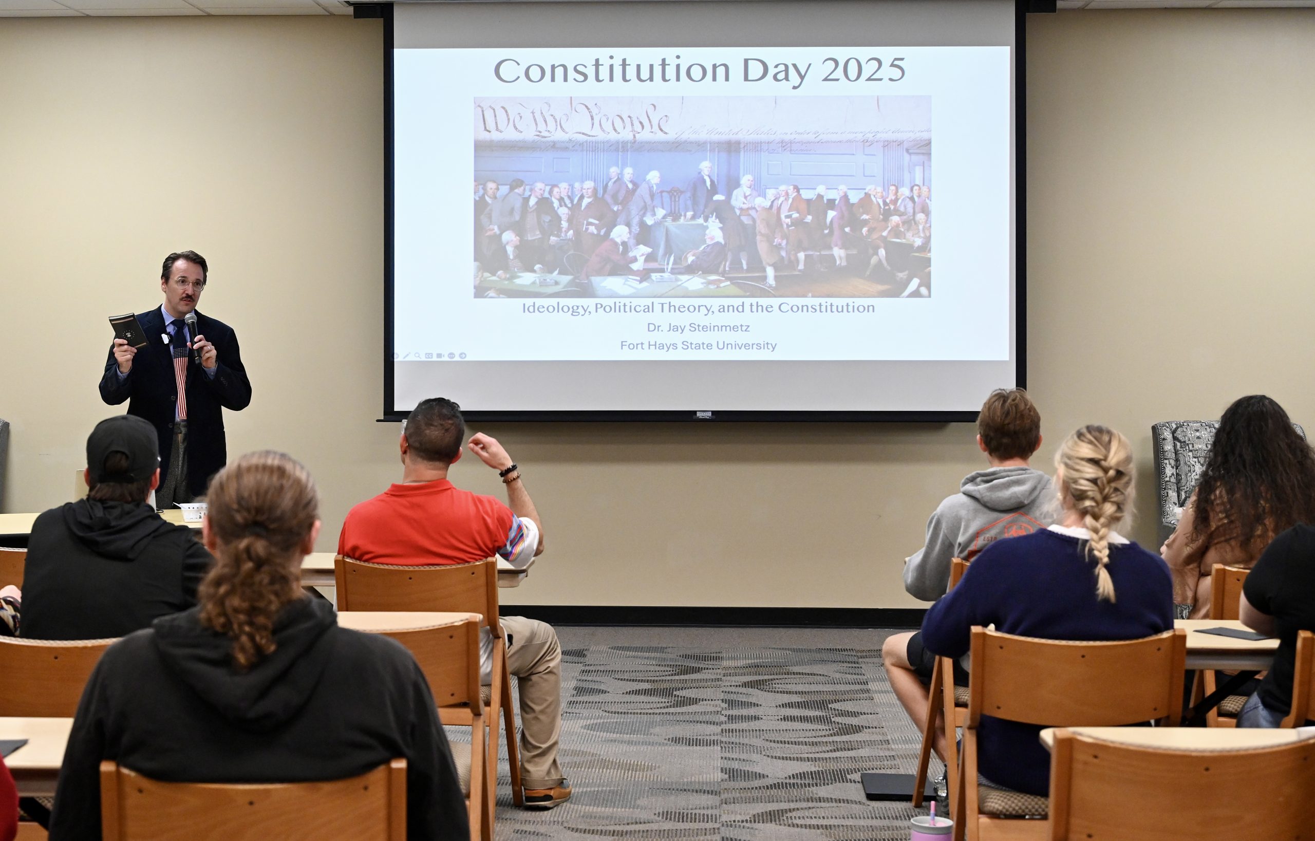 Fort Hays State University’s American Democracy Project hosted the 2025 Constitution Day Times Talk inside Stouffer Lounge in Memorial Union on Wednesday. Jay Steinmetz, an associate professor of Political Science, discussed the motivations and ideologies behind the United States Constitution and which political philosophy it reflects by today’s standards.