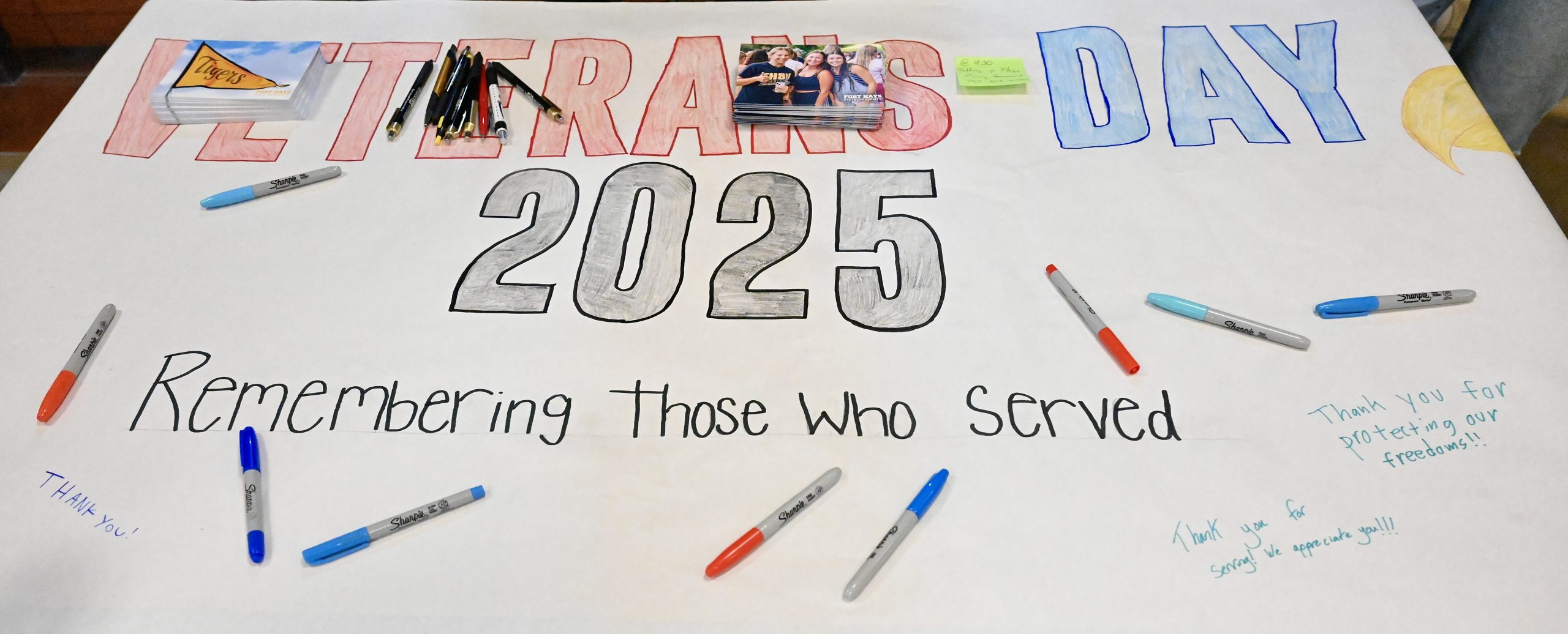 Fort Hays State University’s Office of Student Engagement hosted a Veterans Day event inside Memorial Union on Tuesday, encouraging students to write postcards and letters to war veterans thanking them for their service to mark the holiday. Student workers from the office created a sign where others wrote their messages, which will be sent to the Dodge City VFW.