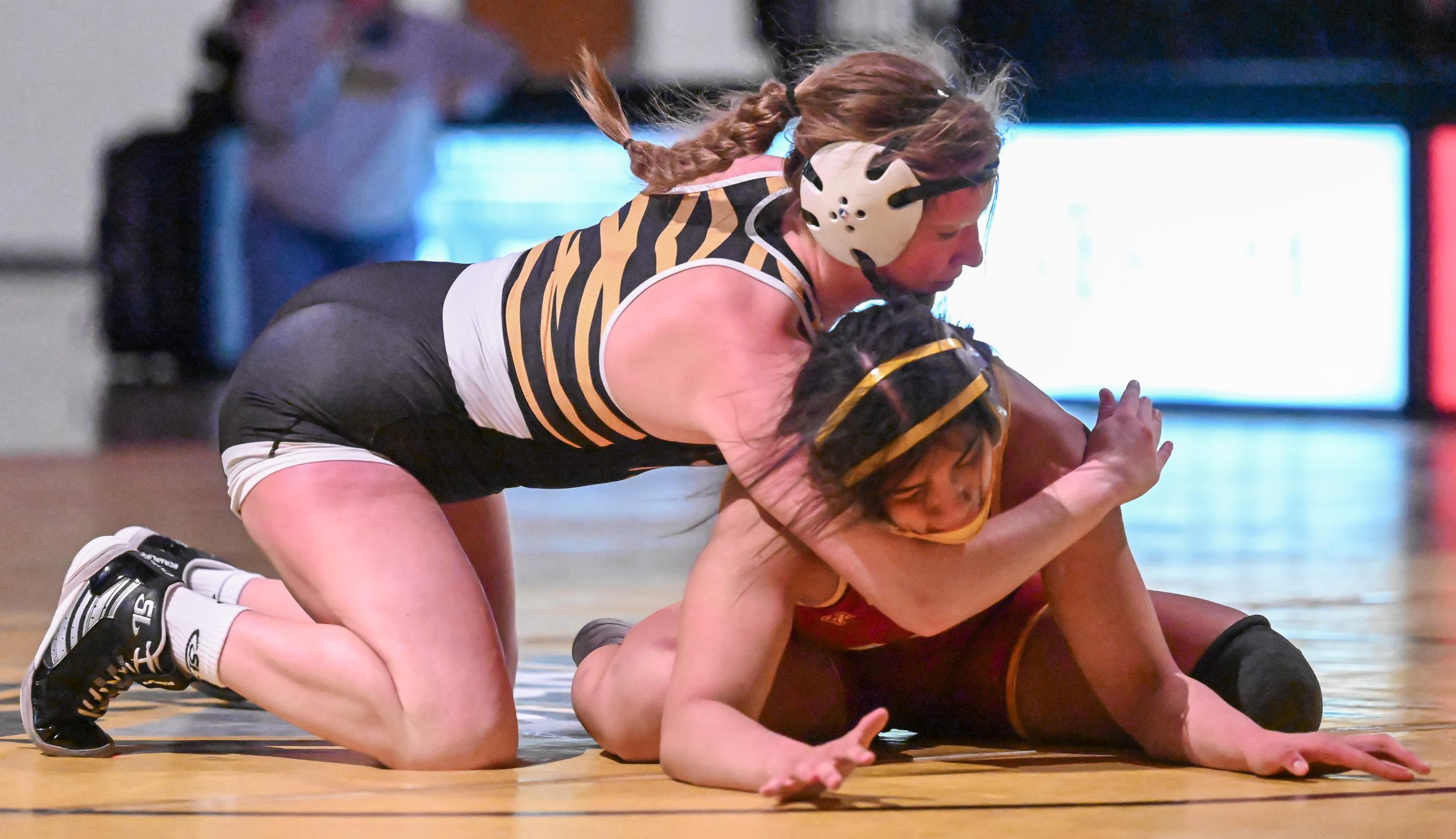 Peyton Hellmann applies her weight on Johanna Steinlicht in the 138 lbs. round.