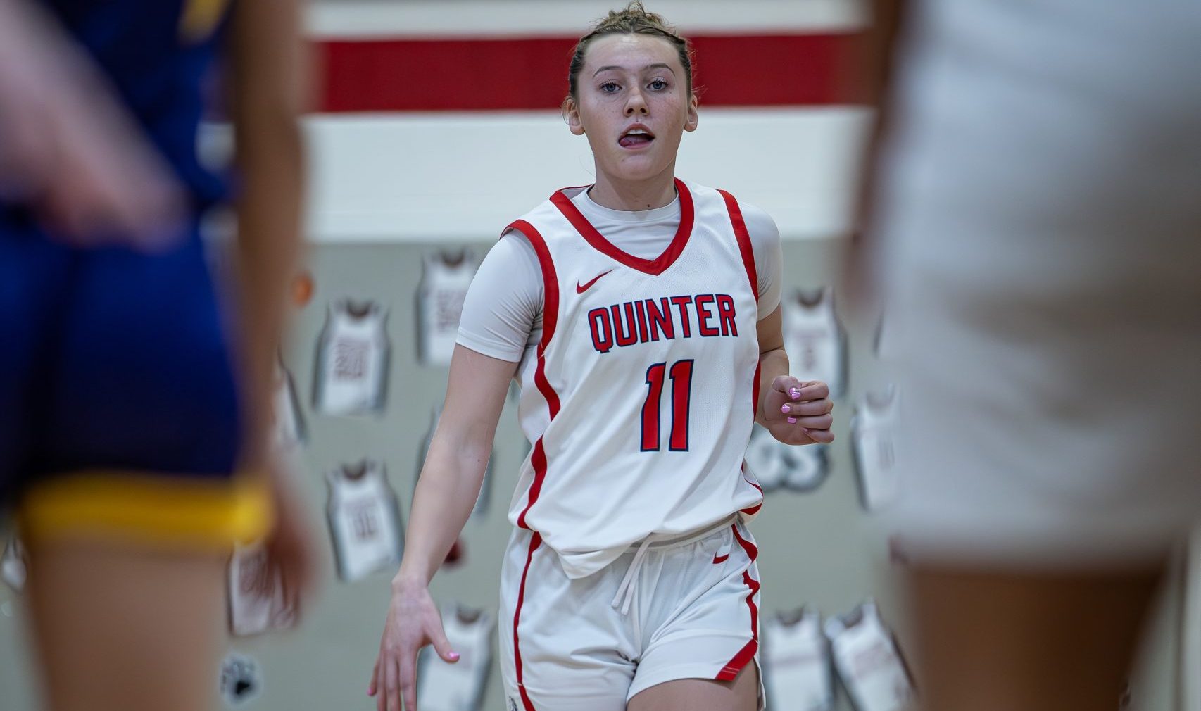 Braelyn Blackwill (#11) drives hard down the lane toward the basket.